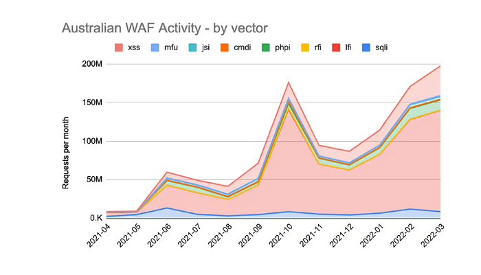 WAF attacks have risen steadily since September 2021, targeting Australian financial services. Get a closer look at the numbers. #cybersecurity #DDoS
