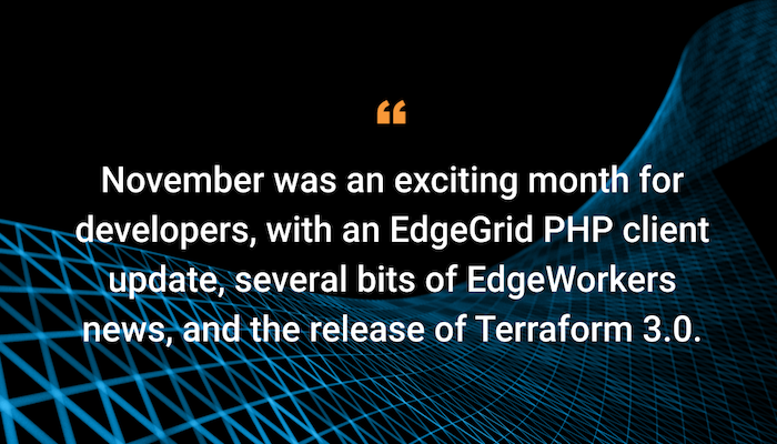 New month, new #developer update! In the November issue, read about an EdgeGrid PHP client update, several bits of #EdgeWorkers news, and more! Learn more: