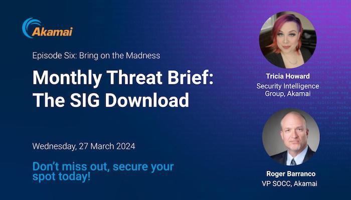 Join Tricia Howard and guest Roger Barranco for The SIG Download series as they discuss the threats they observed over the past 30 days. Sign up today.Akamai Dynamic Signal
