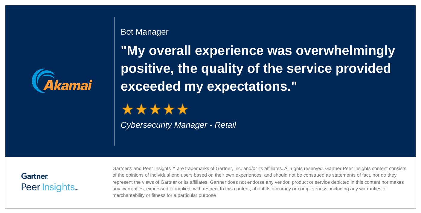 Cybersecurity Manager in the Retail Industry gives Bot Manager 5/5 Rating in Gartner Peer Insights™ Online Fraud Detection Market. Read the full review here: #gartnerpeerinsightsAkamai Dynamic Signal