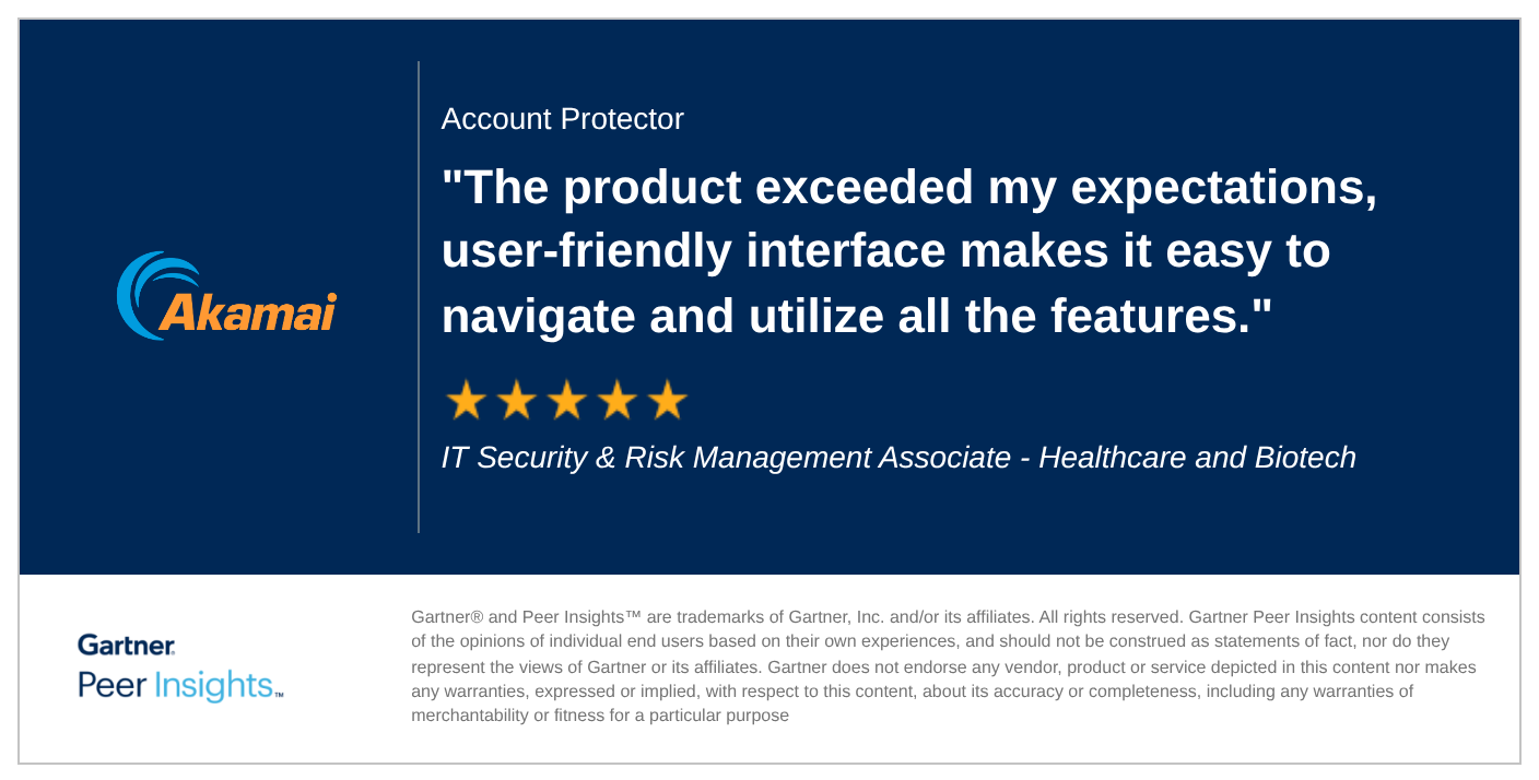 IT Security & Risk Management Associate in the Healthcare and Biotech Industry gives Account Protector 5/5 Rating in Gartner Peer Insights™ Online Fraud Detection Market. Read the full review here: #gartnerpeerinsightsAkamai Dynamic Signal