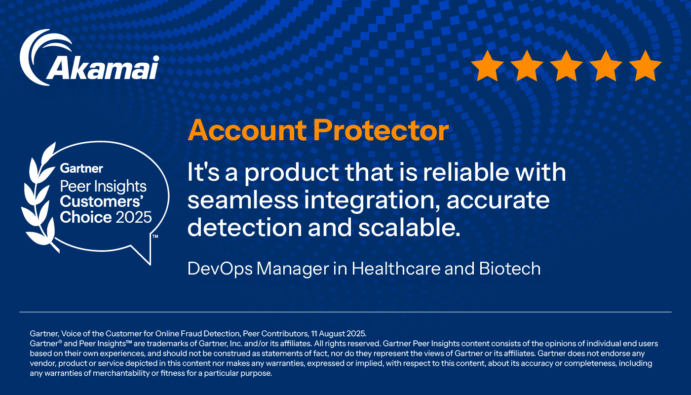 DevOps Manager in Healthcare and Biotech Industry gives Account Protector 5/5 Rating in Gartner Peer Insights™ Online Fraud Detection Market. Read the full review here: #gartnerpeerinsightsAkamai Dynamic Signal